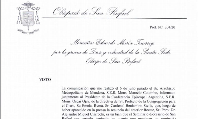 Desde el Obispado de San Rafael se difundió el documento en el que queda escrito lo decretado por Monseñor Taussig de cerrar el Seminario mayor Santa María Madre de Dios.