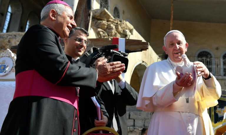 En su viaje apostólico a Irak, el Papa visitó a la comunidad de Qaraqosh, la cuál fue totalmente destruida y actualmente se reconstruye.