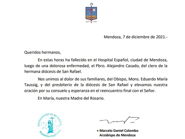 Con la firma de Monseñor Marcelo Daniel Colombo, el Arzobispado de Mendoza quiso estar presente acompañando a familiares y amigos del querido padre Alejandro Casado. “Queridos hermanos, en estas horas ha fallecido en el Hospital Español, ciudad de Mendoza, luego de una dolorosa enfermedad, el Pbro. Alejandro Casado, del clero de la hermana diócesis de San Rafael. Nos unimos al dolor de sus familiares, del Obispo, Mons. Eduardo María Taussig, y del presbiterio de la diócesis de San Rafael y elevamos nuestra oración por su consuelo y esperanza en el reencuentro final con el Señor”, expresa el comunicado.