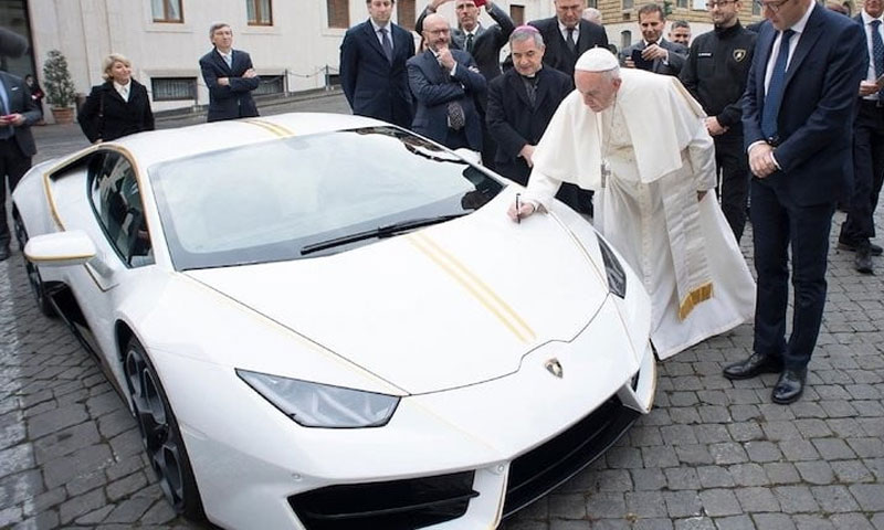 En noviembre de 2017, el fabricante italiano de automóviles Lamborghini presentó al Papa un Huracan RWD Coupé de 580 CV, que el pontífice firmó en el capó del radiador durante la entrega.