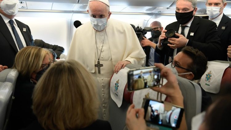 Me alegro de recibirles aquí, después de tantas veces que nos hemos encontrado en el pasillo de los aviones, en entrevistas a gran altura, o de paso en las diversas celebraciones y citas de las peregrinaciones apostólicas en el mundo. ¡Somos compañeros de viaje!