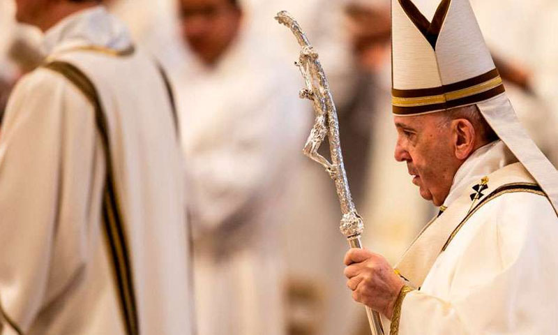 Durante la homilía de la Misa Crismal el Papa enfatizó que “el anuncio de la Buena Noticia está ligado misteriosamente a la persecución y a la Cruz”. Seguidamente cita el texto de los Ejercicios Espirituales de San Ignacio de Loyola, en la contemplación del Nacimiento y afirma: “nos hace mirar y considerar lo que hacen san José y nuestra Señora: «como es el caminar y trabajar, para que el Señor sea nacido en suma pobreza, y al cabo de tantos trabajos, de hambre, de sed, de calor y de frío, de injurias y afrentas, para morir en cruz; y todo esto por mí. Después —agrega Ignacio—, reflexionando, sacar algún provecho espiritual» (Ejercicios Espirituales, 116).